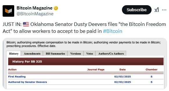비트코인매거진 X 계정에 따르면, 미국 오클라호마주의 더스티 다이버 상원의원이 근로자들이 비트코인으로 급여를 받을 수 있도록 허용하는 '비트코인 자유법(The Bitcoin Freedom Act)'을 발의했다고 전했다.