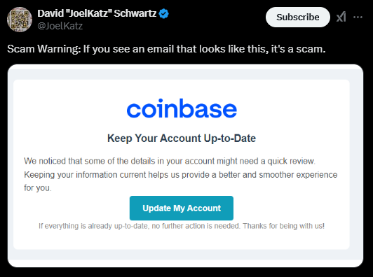 리플의 최고기술책임자(CTO) 데이비드 슈워츠는 11일(현지 시각) X(구 트위터)에 코인베이스 지원팀을 사칭한 이메일을 공개하며, 이를 피싱 시도로 경고했다. 해당 이메일은 사용자에게 계정 정보를 업데이트하라는 내용으로, 사기범들이 공식 이메일과 웹사이트 디자인을 흉내 내어 링크 클릭을 유도하고 개인정보를 탈취하는 방식으로 진행된다.
