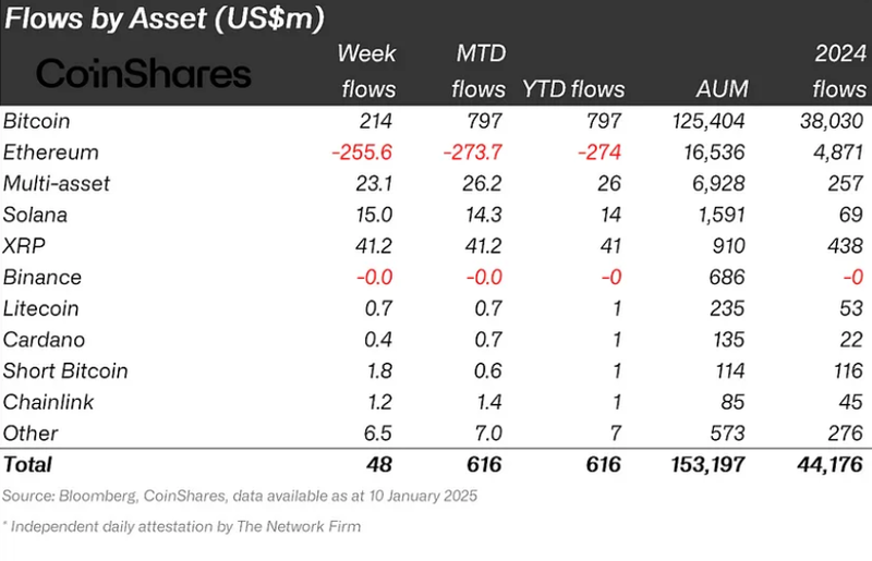 비트코인(BTC)은 주간 기준으로 2억 1,400만 달러의 자금 유입을 기록했으나, 주 후반에는 다른 디지털 자산에 비해 더 큰 규모의 유출을 겪었다. 그럼에도 불구하고 연초부터 현재까지 7억 9,900만 달러의 순유입을 유지하며 가장 뛰어난 성과를 기록 중이다.