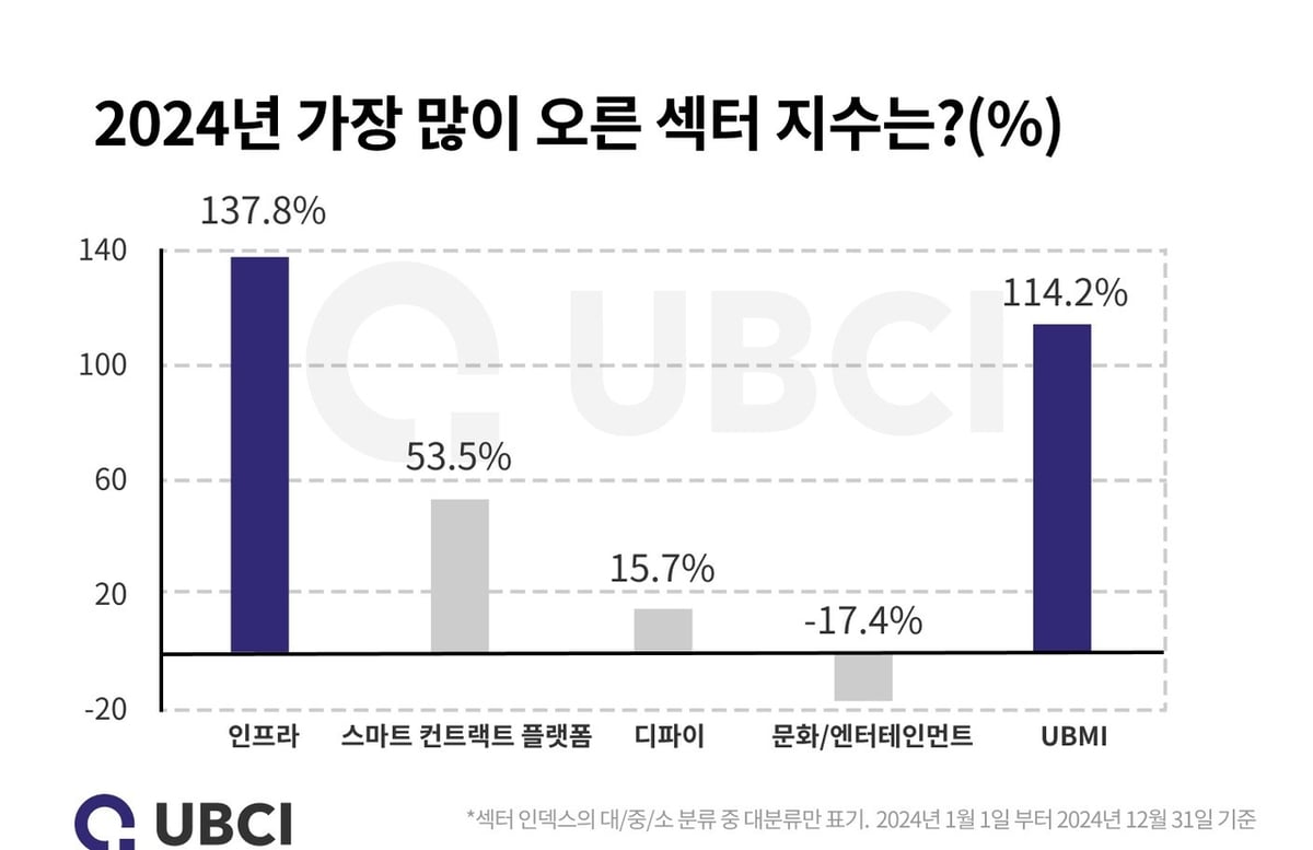 지난해 업비트 원화마켓에서 산출된 UBMI(Upbit Market Index) 지수는 114.2% 상승하며 코스피, S&P500, 금 등 주요 자산군을 웃도는 성과를 기록했다. 대분류 섹터별로는 인프라가 137.8%로 가장 큰 폭으로 올랐으며, 스마트 컨트랙트 플랫폼이 53.5%, 디파이가 15.7% 상승했다.