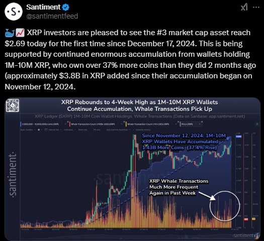 이번 리플의 급등은 미국 증권거래위원회(SEC)와의 법적 분쟁에서 유리한 판결을 받을 가능성이 높아지면서 투자 심리가 긍정적으로 반응한 결과로 보인다. 샌티먼트는 “고래들의 활동과 리플 상승 간의 강한 상관관계가 입증되었으며, 주요 지갑들의 적극적인 참여가 리플의 장기적인 신뢰를 높이고 있다”고 설명했다.