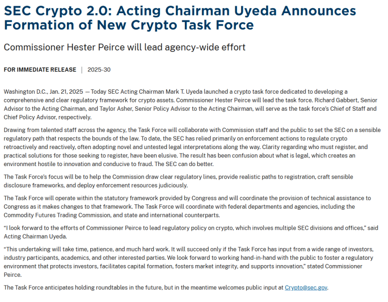 SEC의 마크 우예다 위원장 대행은 22일 성명을 통해, 암호화폐 시장에 대한 SEC의 규제 관할권을 명확히 하고, 합리적인 규제 체계 수립을 목표로 하는 TF팀을 발족한다고 발표했다.