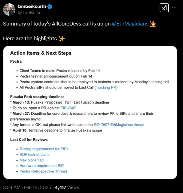 13일 열린 회의에서 이더리움 개발자 25명은 펙트라 업그레이드, 푸사카 업그레이드의 구현 계획을 논의했다.