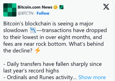 비트코인(BTC) 네트워크 활동이 급격히 감소하면서 8개월 만에 최저 수준에 도달했다. 이는 시장의 불확실성으로 인해 투자자들의 관심과 거래량이 줄어든 결과로 해석된다.