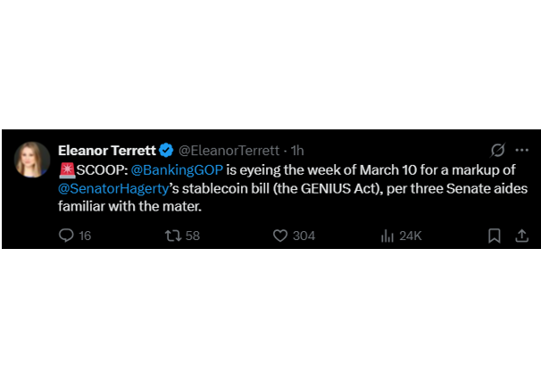 미 상원 은행위 표결 예정 소식 (출처: @EleanorTerrett, X)