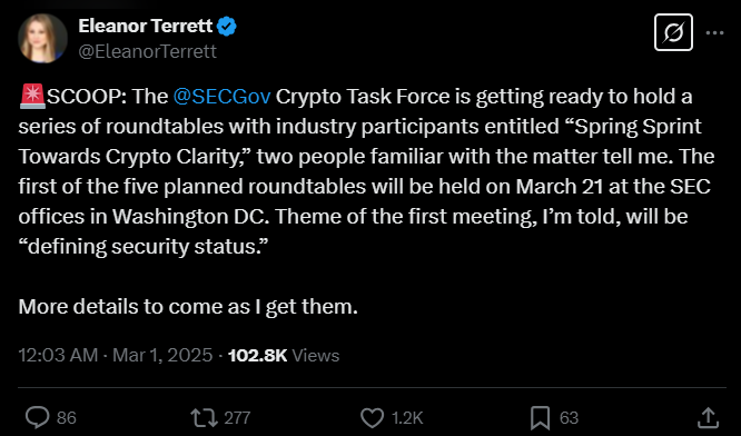 폭스비즈니스 기자 엘리노어 테렛은 SEC가 "Spring Sprint Towards Crypto Clarity"라는 주제로 총 다섯 차례의 회의를 열 예정이며, 첫 회의는 3월 21일 워싱턴 DC SEC 본청에서 진행된다고 보도했다.