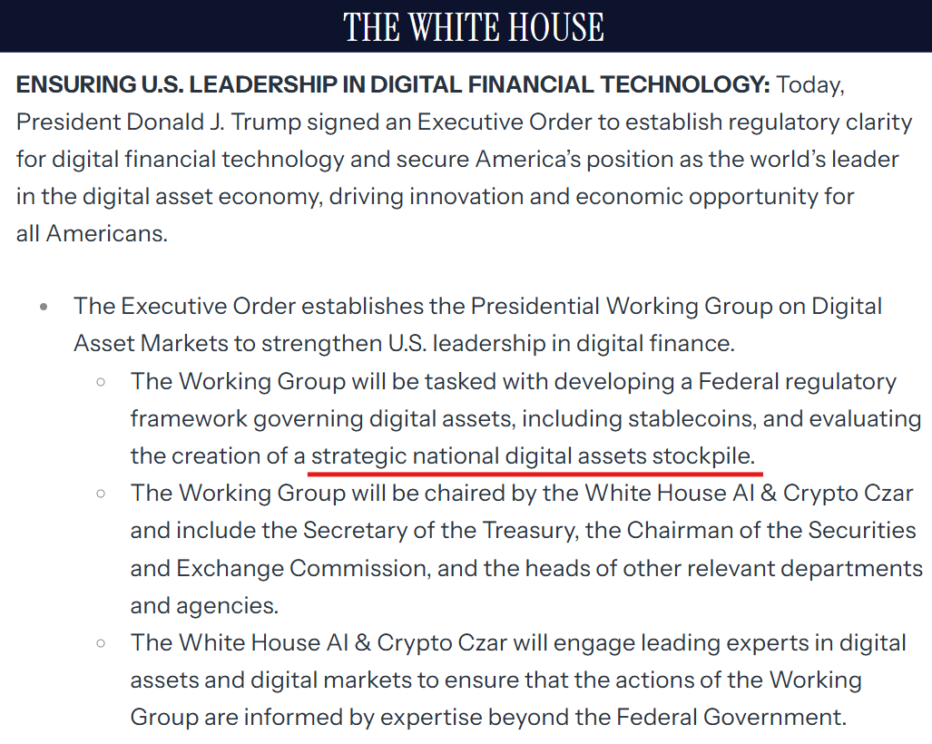 트럼프는 "미국의 암호화폐 준비금은 바이든 행정부가 수년간 펼친 부당한 공격 이후 이 중요한 산업을 다시 활성화하기 위한 조치"라며, "대통령 실무 그룹(Presidential Working Group)에 XRP, 솔라나, 카르다노를 포함한 암호화폐 전략적 준비금을 추진하도록 지시했다"고 강조했다. 이어 "미국이 세계의 암호화폐 중심지가 될 것"이라고 덧붙였다.
