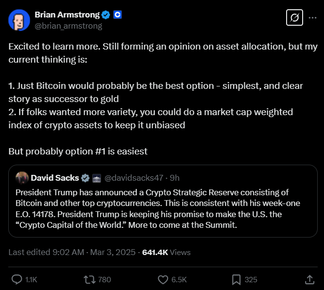 코인베이스 CEO 브라이언 암스트롱이 미국 정부의 암호화폐 전략비축(Crypto Strategic Reserve)에 대해 비트코인(BTC) 단독 구성이 가장 효율적이라는 견해를 밝혔다.