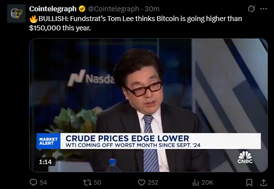 비트코인 시장 분석하는 톰 리 (출처: @Cointelegraph, X)