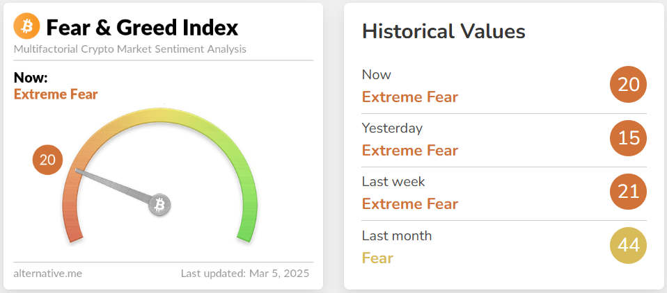 암호화폐 데이터 제공 업체 알티너티브(Alternative)에 따르면, 공포·탐욕 지수는 전날보다 5포인트 상승하며 20을 기록했다. 이 지수는 0에 가까울수록 투자자들이 극단적인 공포를 느끼고 있으며, 100에 가까울수록 시장이 과열되었음을 나타낸다.