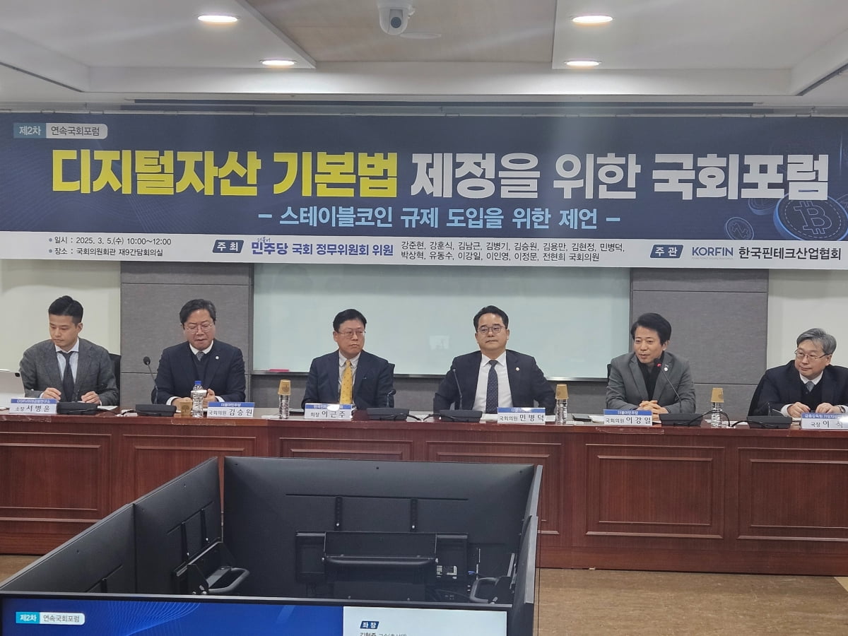 5일 국회에서는 더불어민주당 국회 정무위원회 위원과 한국핀테크산업협회 주최로 '디지털자산 기본법 제정을 위한 국회포럼'이 열렸다. 이번 포럼에서는 글로벌 스테이블코인 규제 동향을 살펴보고, 국내 입법 방향에 대한 논의가 이뤄졌다.