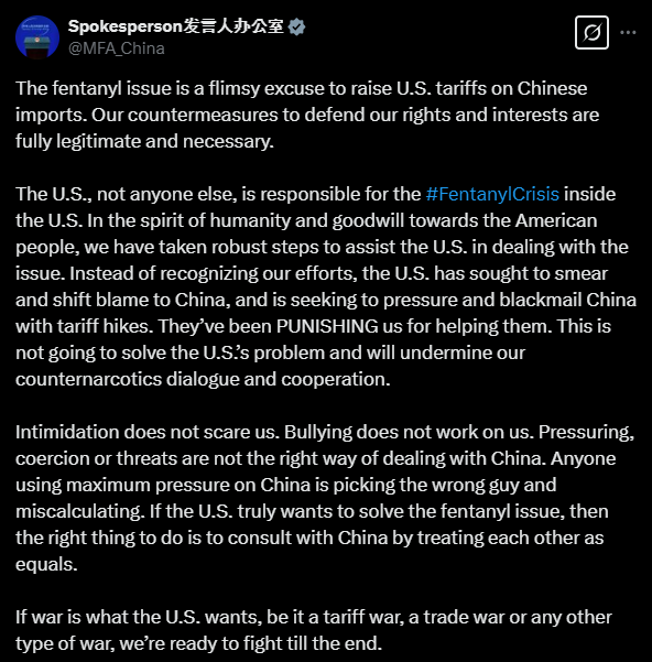 중국은 미국이 자국의 펜타닐 유입 문제를 문제삼으며 관세를 인상한 것에 대해 비판의 목소리를 냈다. 중국 외교부 대변인은 "펜타닐 문제 해결을 위한 진지한 협력이 필요하다"며 "미국은 중국을 압박하고 협박하려 하지 말고, 서로를 동등하게 대하며 협의하는 것이 옳은 방법"이라고 주장했다.