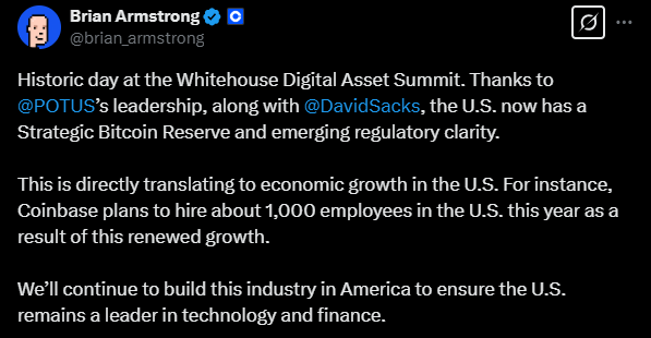 올해 미국에서 약 1,000명을 고용할 계획이 있다는 코인베이스 CEO (출처: @brian_armstrong, X)