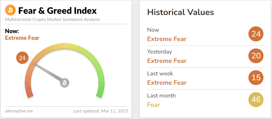 암호화폐 데이터 제공 업체 알티너티브(Alternative)에 따르면, 공포·탐욕 지수는 전날보다 4포인트 상승하며 24를 기록했다. 이 지수는 0에 가까울수록 투자자들이 극단적인 공포를 느끼고 있으며, 100에 가까울수록 시장이 과열되었음을 나타낸다.
