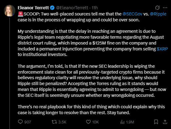 리플과 SEC간 합의 조건을 조율 중이라는 소식 (@EleanorTerrett, X)