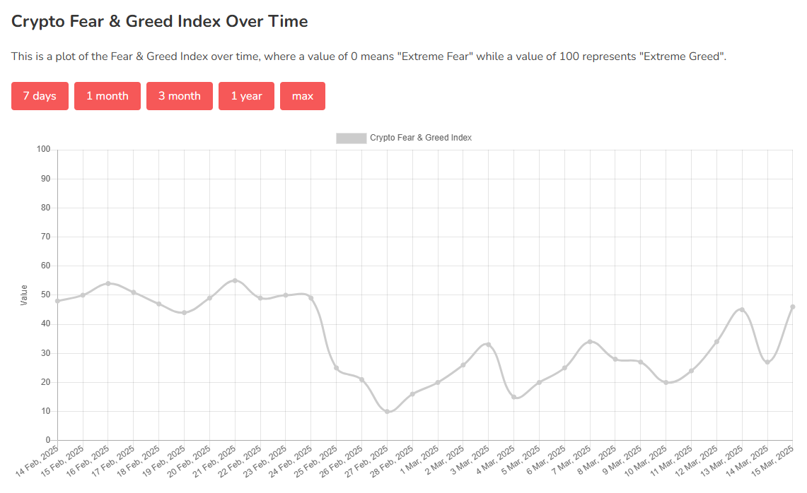 암호화폐 시장의 투자 심리가 급격히 회복되며 ‘공포·탐욕 지수’가 46까지 상승했다.
