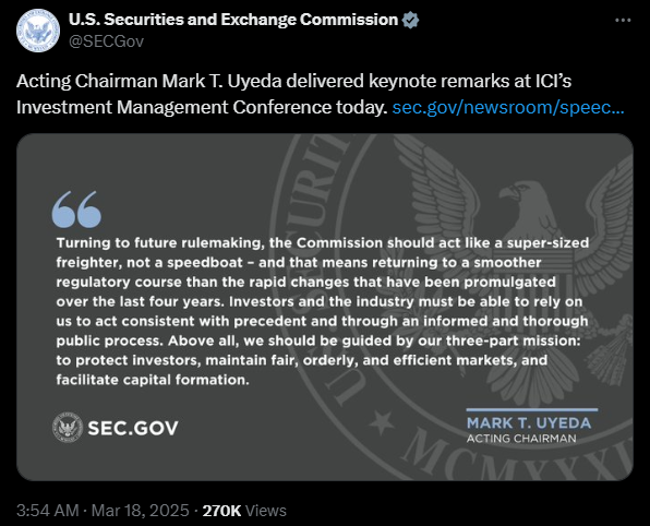 마크 우예다 SEC 위원장 대행의 ICI 투자 관리 컨퍼런스 연설문 (출처: @SECgov, X)