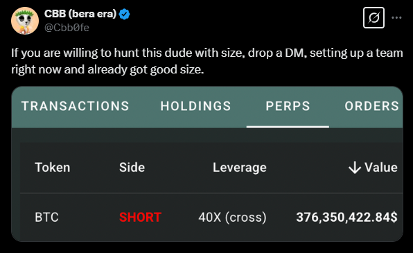 대형고래를 청산시키기 위해 소규모 트레이더들이 협력하려는 시도 (출처: @Cbb0fe, X)