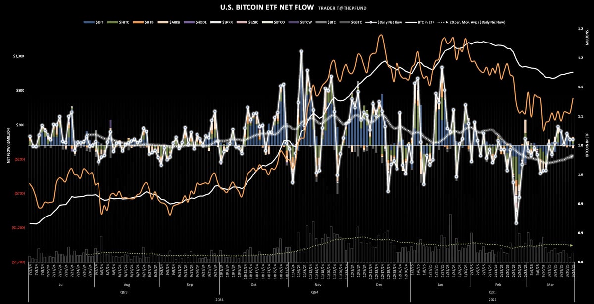 미국 비트코인 현물 ETF 시장으로의 자금 유입이 지속되고 있다. 3월 24일(현지시간) 기준, 총 8420만 달러(약 1237억 원)의 순유입이 발생하며 7거래일 연속 순유입세를 이어갔다.