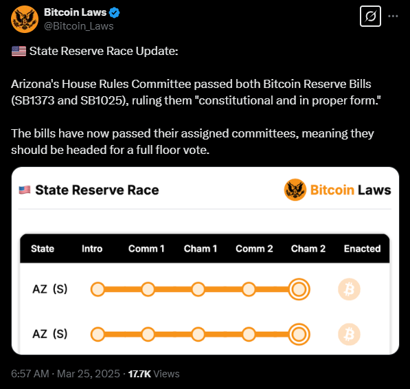 24일(현지시간) 애리조나주 하원 규칙위원회가 통과시킨 비트코인 매집 법안 ‘SB1373’과 ‘SB1025’ (출처: @Bitcoin_Laws, X)