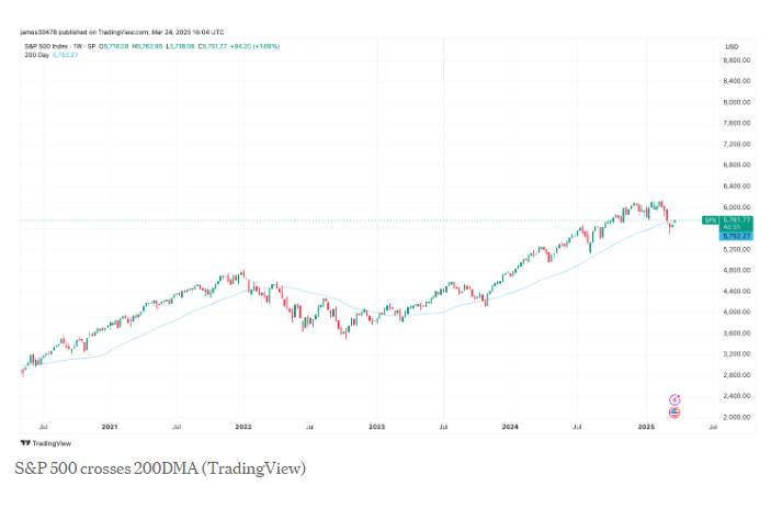 미국 증시와 암호화폐 시장이 동시에 기술적 반등 신호를 보내고 있다. S&P 500 지수는 200일 이동평균선(200DMA)을 상향 돌파했고, 비트코인도 비슷한 흐름 속에 주요 저항선을 넘어서며 강세 전환 가능성을 높이고 있다.