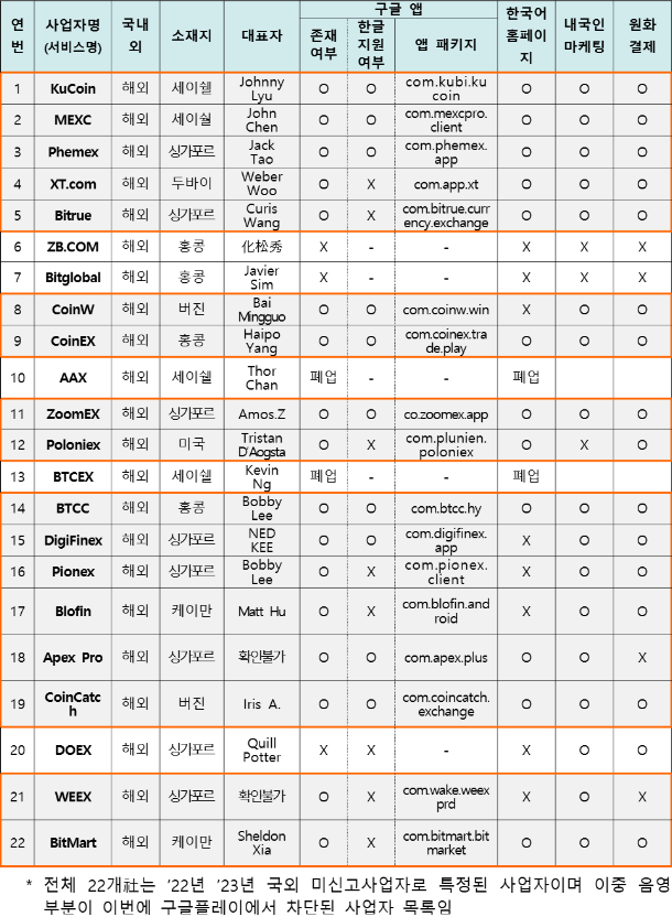 미신고 영업을 하다가 차단당한 해외 거래소들 (출처: 금융위원회)