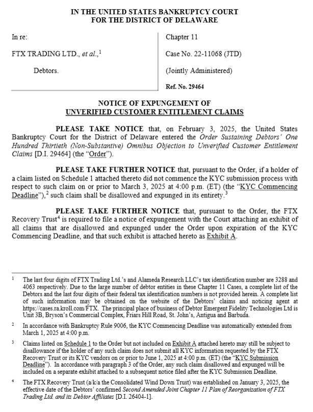 미국 델라웨어 파산 법원에 4월 2일자로 제출된 문서에 따르면, FTX 채권자 중 약 39만2000명이 필수적인 KYC 절차를 시작하지 않은 상태로 확인됐다. 해당 절차는 FTX 측이 채무 상환을 진행하기 위한 전제 조건으로 명시한 것으로, 일정 내 KYC를 개시하지 않으면 채권 자격 자체가 소멸될 수 있다.