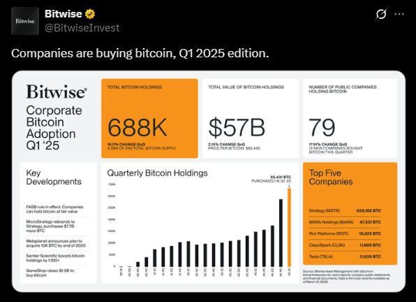 Analysis Of Corporate Bitcoin Holdings For Q1 2025 Announced By Bitwise (Source: @BitwiseInvest, X)