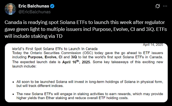 Canada will launch the world's first Solana (SOL) based spot Exchange Traded Fund (ETF) on April 16. This ETF includes staking functionality beyond a simple cryptocurrency holding product, allowing investors to expect additional returns just from holding assets.