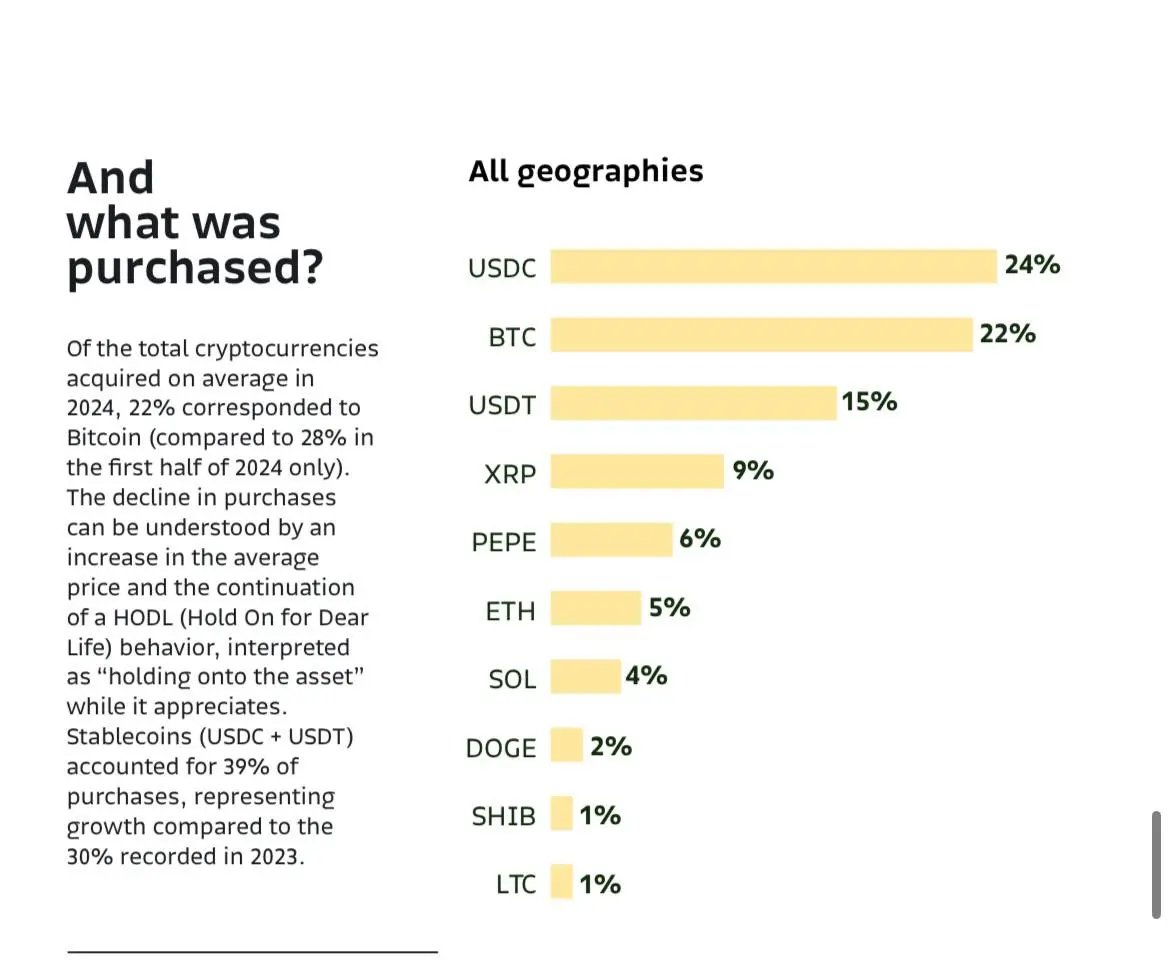 However, in terms of portfolio ratios, Bitcoin remains the most dominant at 49%. However, this is a decrease from last year's 57%, seemingly influenced by the rise of meme coins and altcoins, and stablecoins. In fact, the most purchased cryptocurrency by users this year has shifted to Circle's USDC (24%), with Tether USDT following at 15%.