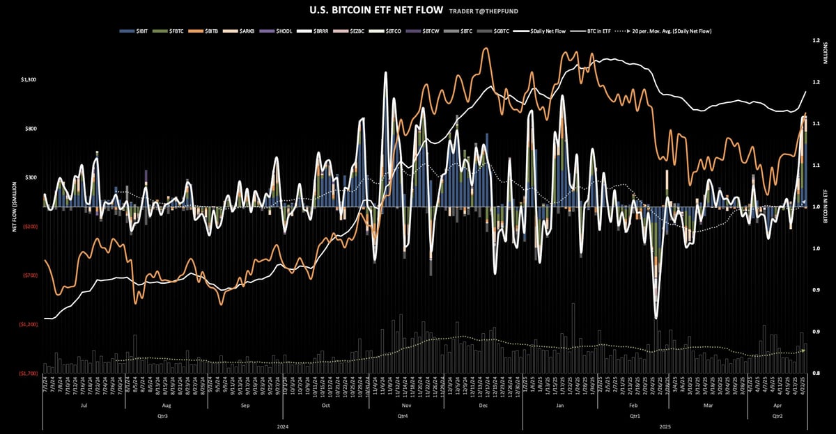 According to cryptocurrency data analyst Trader T, on April 23, funds inflowed into the spot Bitcoin ETF amounted to a total of $917.67 million. Especially over the recent three trading days, the inflows amounted to $2.2 billion, marking the strongest weekly flow since the first week of the ETF launch in December last year.