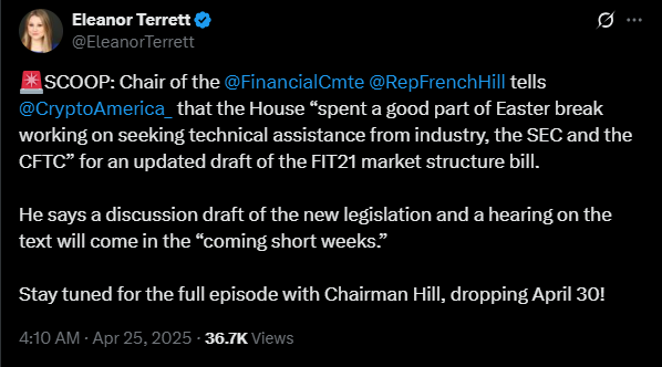 Crypto America Host Eleanor Terrett Reported On The 24th (Local Time) On X, Reiterating The Remarks Of The Vice Chair Of The House Financial Services Committee, French Hill, Stating That "Congressman Hill Has Proceeded With Bill Amendments By Receiving Technical Advice From The Cryptocurrency Industry, The SEC (Securities And Exchange Commission), And The CFTC (Commodity Futures Trading Commission) Throughout The Easter Holiday."