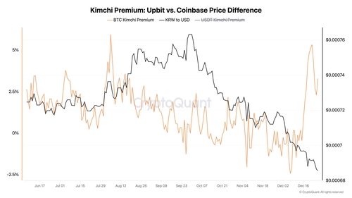 한국에서 정치적 혼란이 심화되면서 비트코인의 김치 프리미엄이 크게 상승했다.