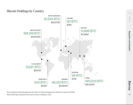 글로벌 투자 관리 기업인 비트와이즈(Bitwise)는 비트코인 트레저리스(BitcoinTreasuries.net) 데이터를 인용하여 21일(현지시간) 엑스(구 트위터)에서 공개한 자료에서 2024년 1월 15일 기준으로 미국이 19만 8109 BTC를 보유하고 있다고 밝혔다. 이는 약 19억 6350만 달러에 달하는 금액이다.