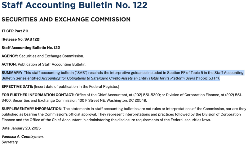 SEC, 암호화폐 채택 막았던 SAB 121 회계지침 공식 폐지