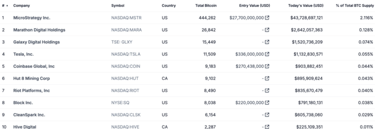 마이크로스트래티지가 가장 많은 비트코인을 보유하며 1위를 기록했다. 그 뒤를 이어 채굴업체 마라톤 디지털 홀딩스가 2위, 투자사 갤럭시 디지털 홀딩스가 3위를 차지했다.