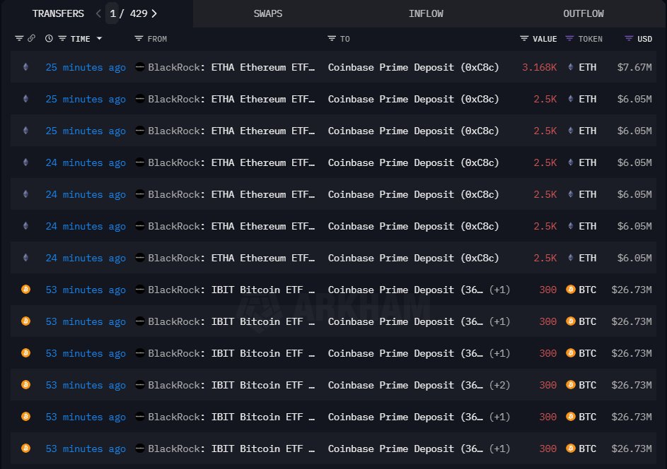 블랙록의 BTC·ETH 입금 내역 (출처: Cointelegraph)