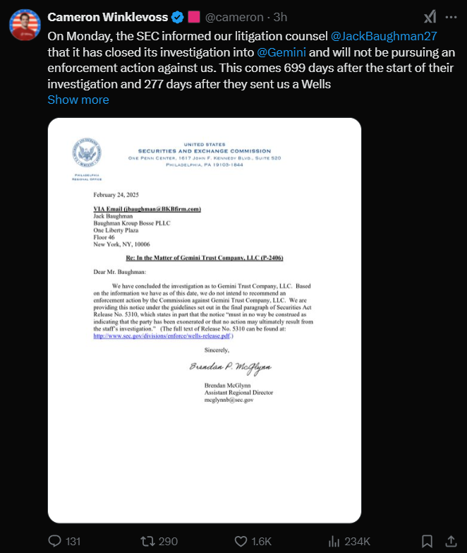 제미니 공동 창업자 카메론 윙클보스가 공유한 SEC의 제미니 수사 종결 통보 서한 (출처: @cameron, X)