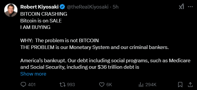 베스트셀러 <부자 아빠, 가난한 아빠>의 저자 로버트 기요사키가 최근 비트코인 급락을 '세일'로 표현하며 추가 매수 의사를 밝혔다.