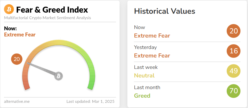 암호화폐 데이터 제공 업체 알티너티브(Alternative)에 따르면, 공포·탐욕 지수는 전날보다 4포인트 상승하며 20을 기록했다. 이 지수는 0에 가까울수록 투자자들이 극단적인 공포를 느끼고 있으며, 100에 가까울수록 시장이 과열되었음을 나타낸다.