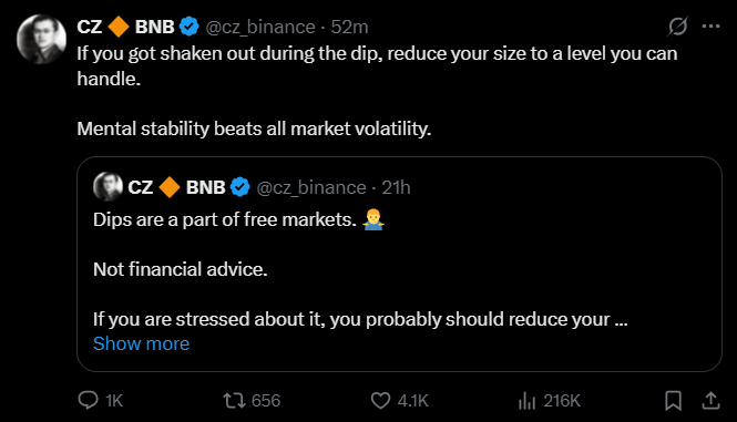 하락장 전략 제시하는 CZ (출처: @cz_binance, X)