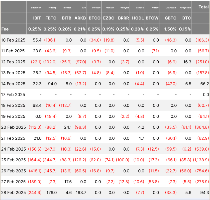 2월 28일, 미국에서 거래되는 11개의 현물 비트코인 ETF들은 총 9,430만 달러 규모의 순유입을 기록하며 8일 연속 이어진 총 32억 달러 이상의 순유출 흐름을 끊어냈다. 이날 비트코인 가격은 최저 7만8,000달러까지 하락한 후 반등해 8만4,900달러 선을 회복했다.