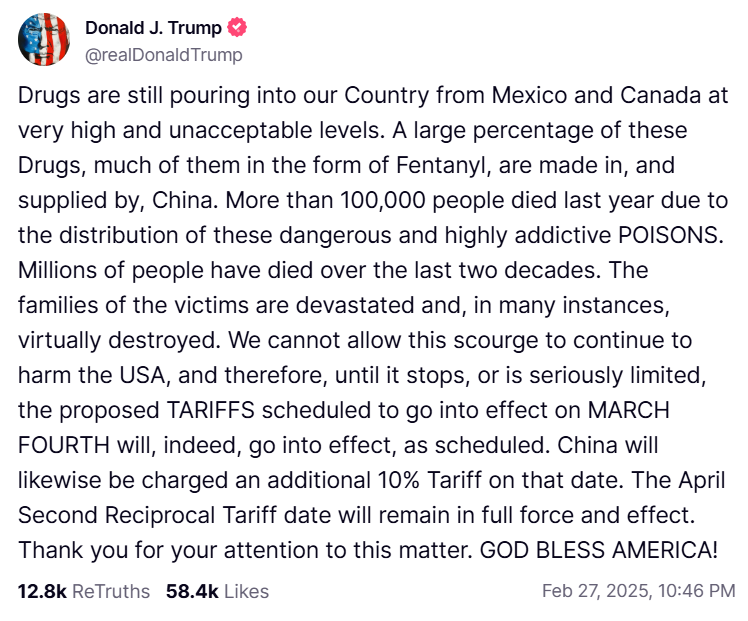 트럼프는 27일(현지시간) 자신의 소셜미디어 플랫폼 트루스소셜에 "캐나다와 멕시코에서 유입되는 마약 문제가 해결되지 않으면 3월 4일 25% 관세를 부과할 것이며, 중국에도 같은 날 10% 추가 관세를 매길 것"이라고 선언했다. 그는 "중국에서 제조된 펜타닐이 캐나다와 멕시코를 거쳐 미국으로 밀반입되고 있으며, 이를 방치할 수 없다"고 강조했다.