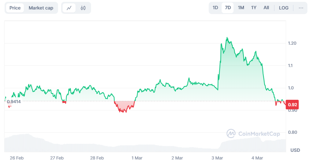 한편, 4일 오후 4시 50분 기준, 온도는 전일 대비 18.2% 하락한 0.92달러에 거래되고 있다.