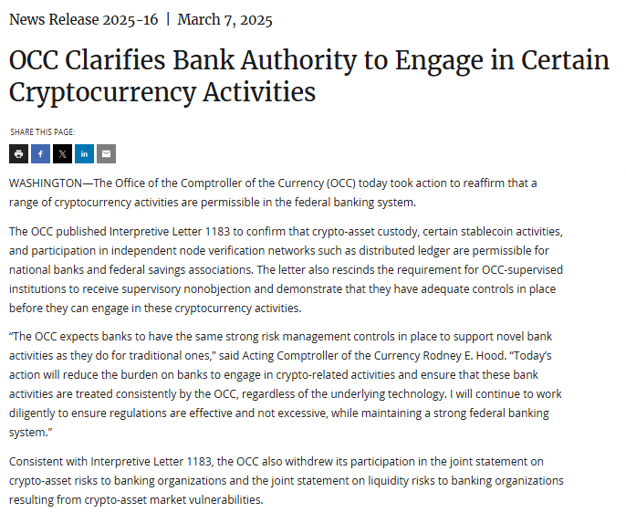 미국 통화감독청의 발표 내용 (출처: OCC)