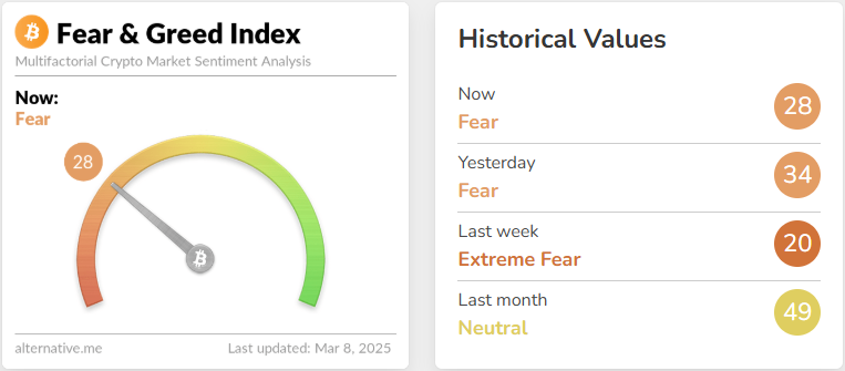 암호화폐 데이터 제공 업체 알티너티브(Alternative)에 따르면, 공포·탐욕 지수는 전날보다 6포인트 하락하며 28을 기록했다. 이 지수는 0에 가까울수록 투자자들이 극단적인 공포를 느끼고 있으며, 100에 가까울수록 시장이 과열되었음을 나타낸다.