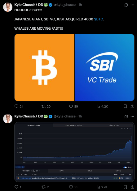 SBI VC의 비트코인 매수 소식 (출처: @kyle_chasse, X)