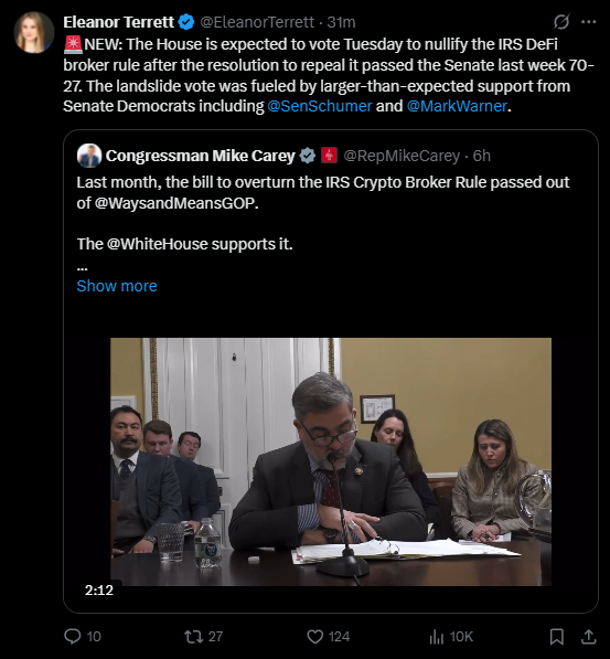 폭스비즈니스 기자 엘리노어 테렛은 11일(현지시간) 자신의 X 계정을 통해 "미국 하원이 IRS의 디파이 브로커 규정 철회안을 표결에 올릴 예정"이라고 밝혔다.