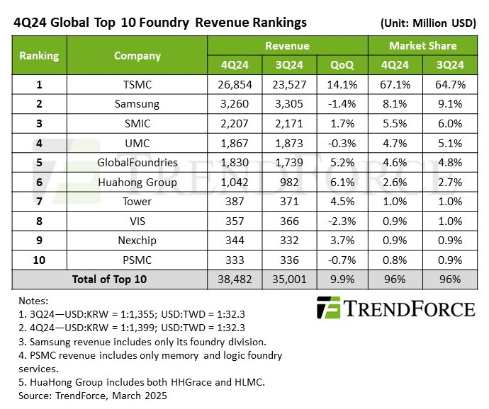 전체 시장은 성장세를 보였다. 글로벌 10대 파운드리 업체의 4분기 총매출은 384억8200만 달러로 전 분기 대비 9.9% 증가했다. 그러나 삼성전자의 점유율 하락과 맞물려 중국 업체들의 성장이 두드러지고 있다.