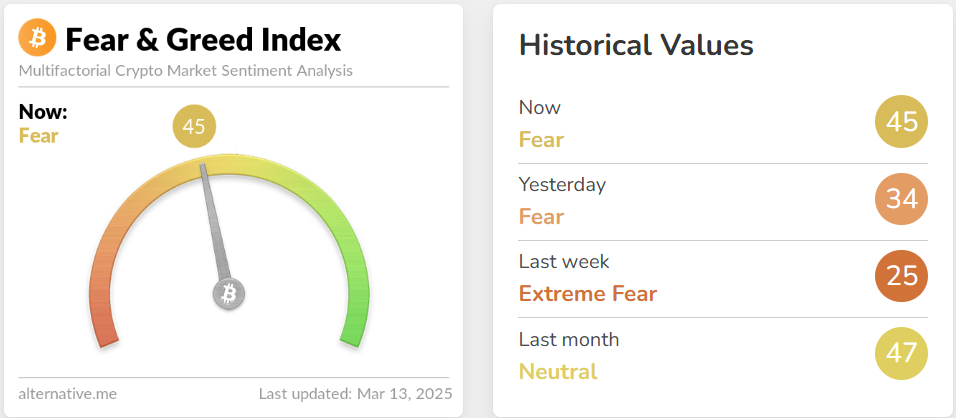 암호화폐 시장의 투자 심리가 회복되며 ‘공포·탐욕 지수’가 45까지 회복됐다. 이는 지난 2월 25일 트럼프의 관세 정책 발표 이후 하락장이 시작되기 직전 수준까지 회복된 수치다.